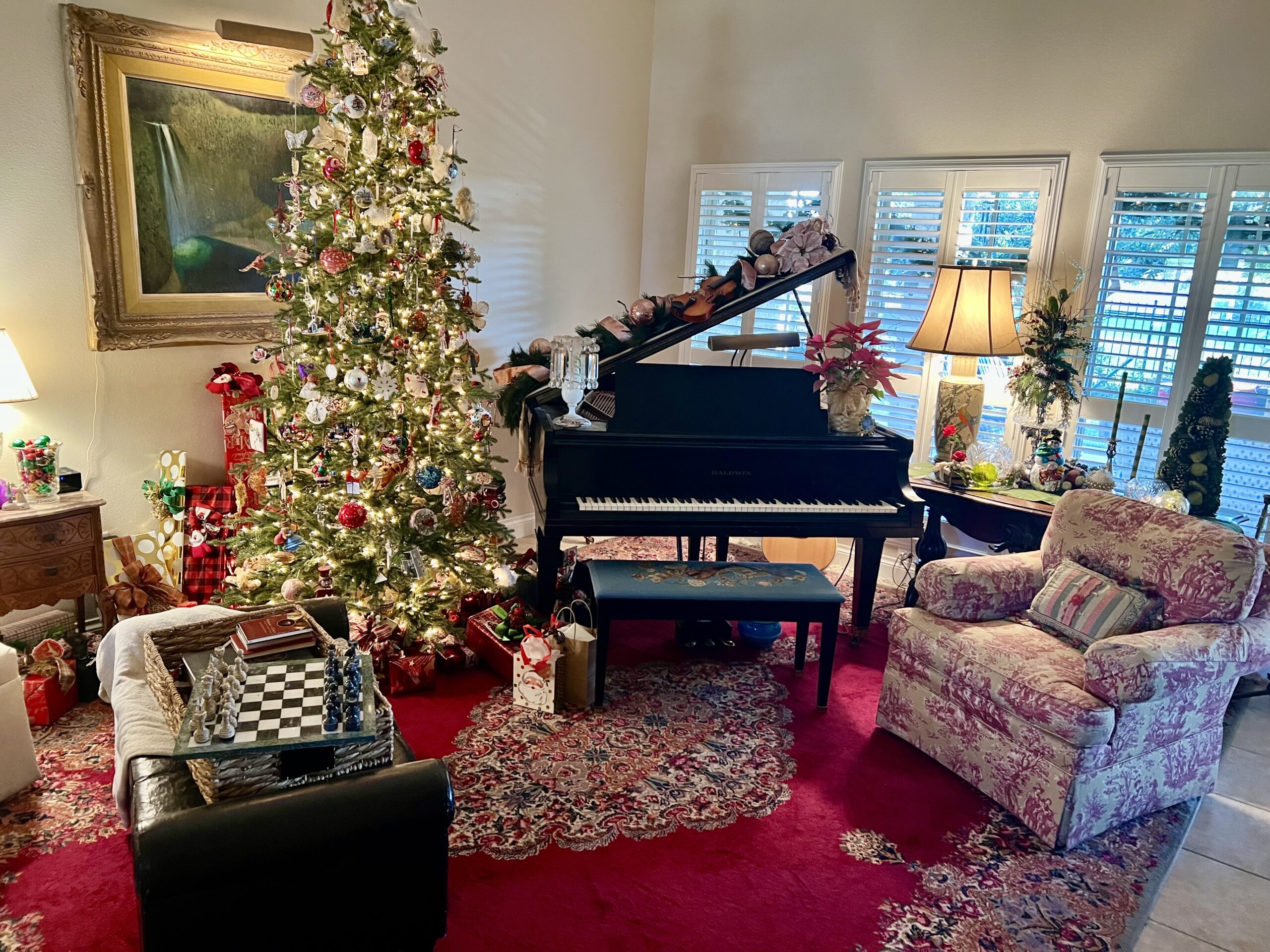 As she pulls out nostalgic ornaments from family and friends, she calls it “a walk down memory lane.” She doesn’t have themed trees, per se, but every year she decorates a “nature tree” inspired by Christmases past when she and her family would make a special trip to cut down a live tree. Several Waterford angel ornaments are especially treasured because they were gifts from her late mother.