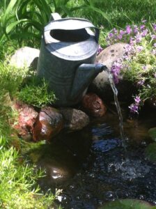 If that sounds too daunting, try a watering can fountain. This creative repurposing utilizes a galvanized watering can as the decorative element, which produces a whimsical and fun water feature. This type of fountain can be created in less than an hour using the watering can, a rectangular plastic storage bin, some river rock, a grate or piece of stiff screening, and a fountain pump with tubing. This fountain can be made for $50 or less if you already have some of the supplies. I don’t know about you, but I already own a storage bin that could be (read: will soon be) repurposed for this project. A downside of this fountain is that it is stationary and can’t be moved around the yard, since the water reservoir (plastic storage bin) is set in the ground.