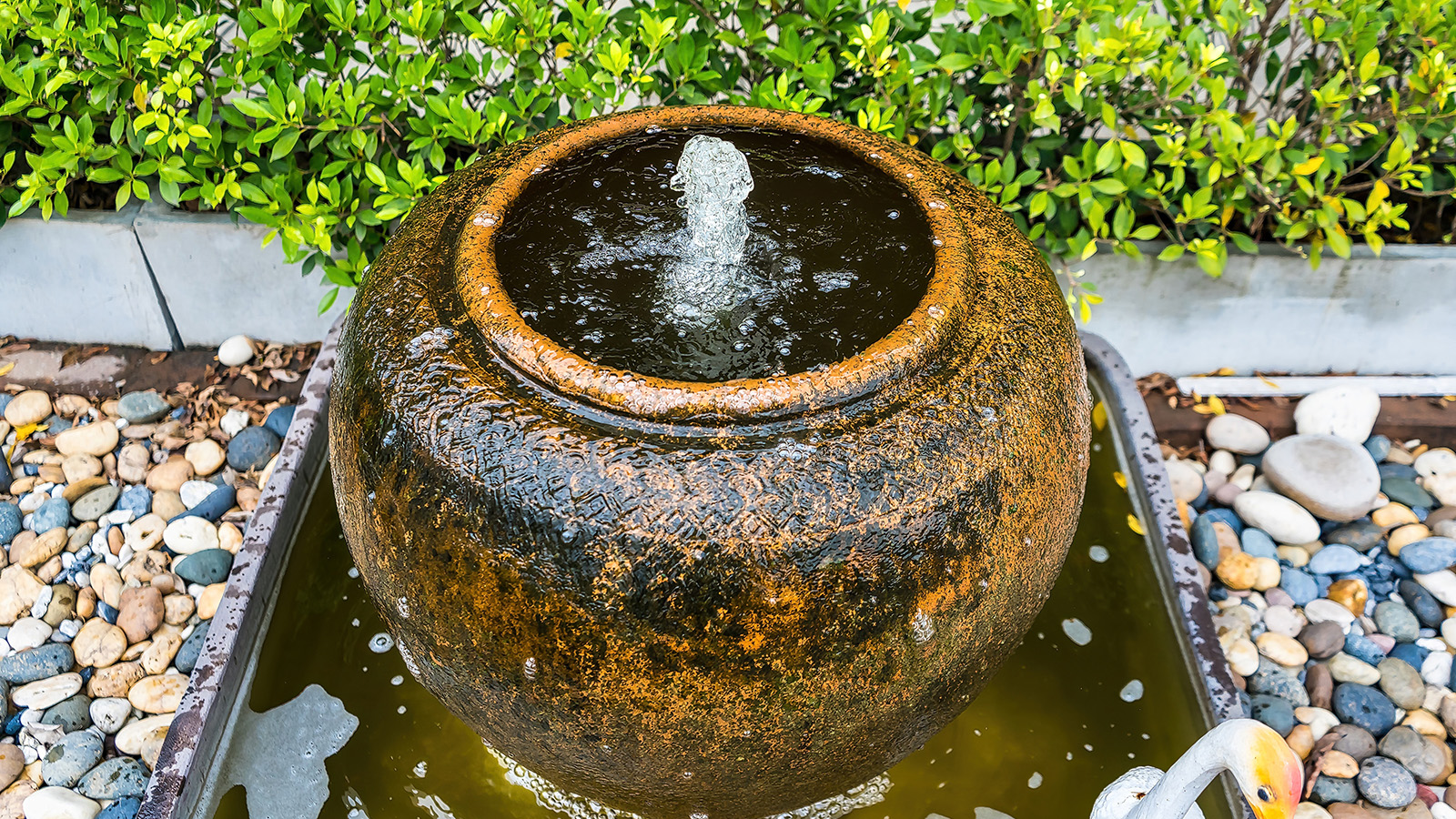 Use a large ceramic pot as the main decorative element in this first type of fountain. You can choose a more neutral-colored pot that will blend into the background a bit or go big and bold with a bright color that will make a statement. The size and shape of pot that you choose is also up to you, but remember that the water pump will be inside the pot, so your pot would probably need to be at least 15 inches tall. If you are ambitious, you can also build a stacked fountain using several pots of different sizes with the pump housed in the largest one at the bottom. These types of fountains are reasonably easy to create in a few hours and can be moved to different spots in the garden, provided you have access to an electrical outlet or are using a solar pump.