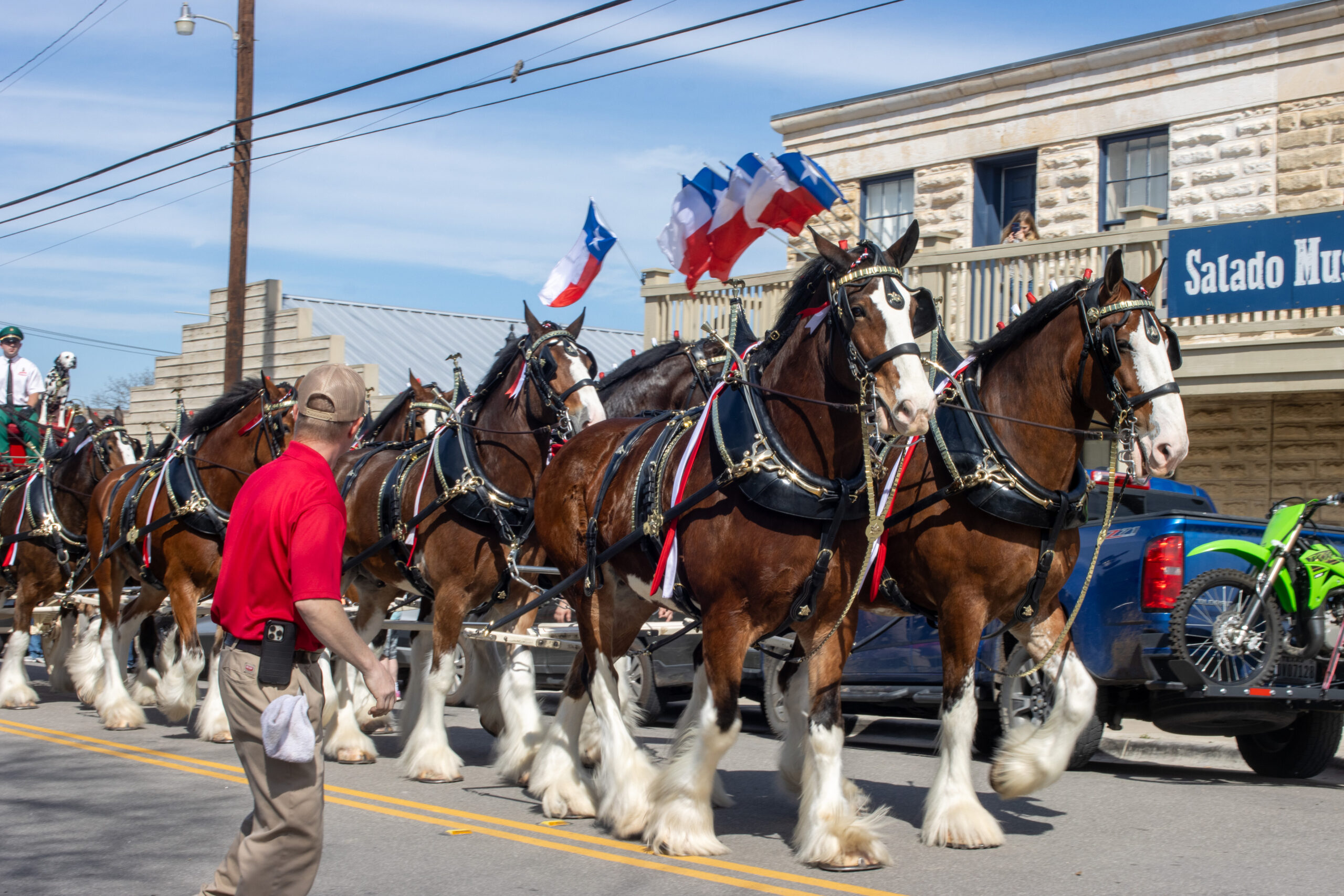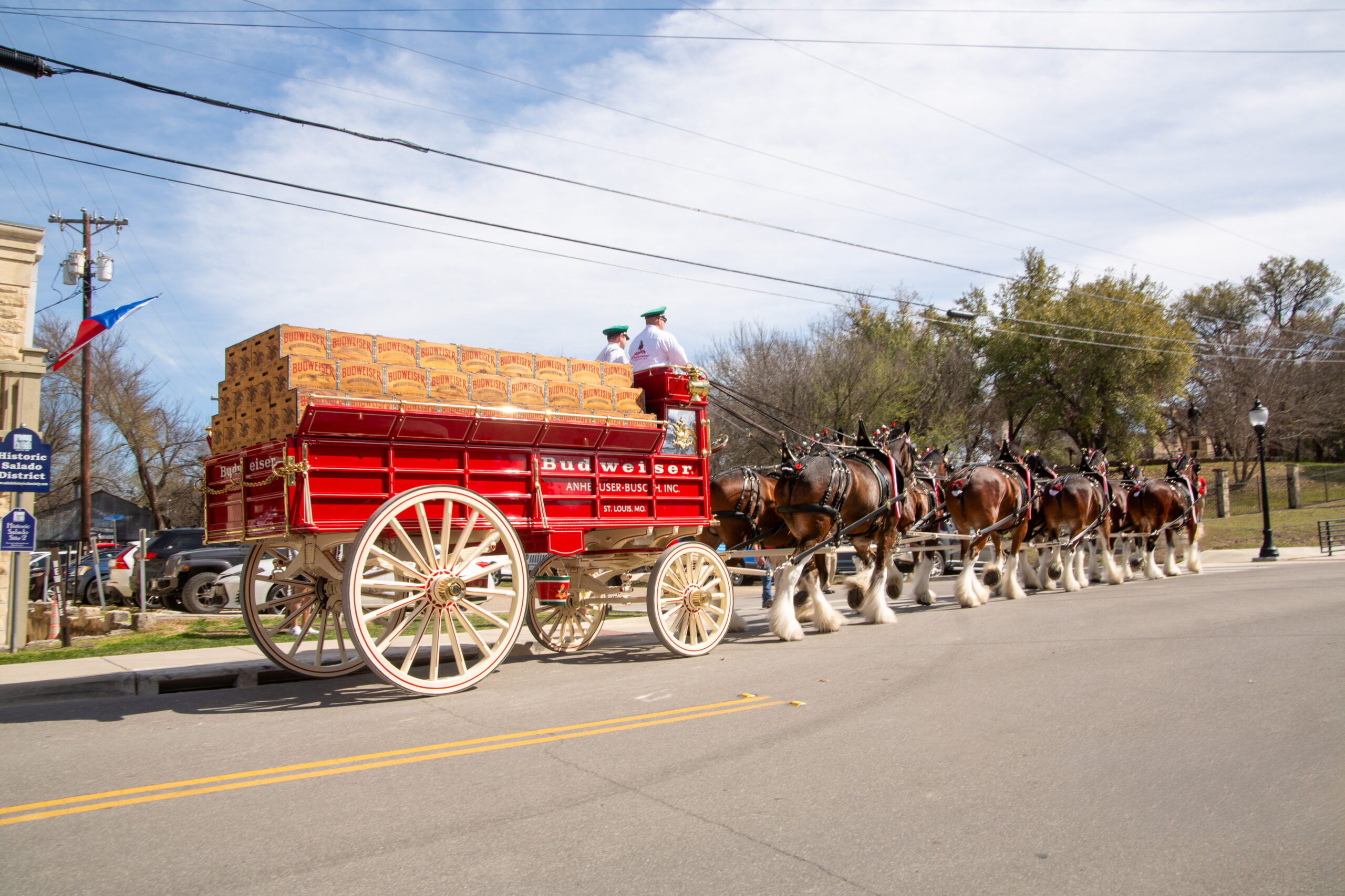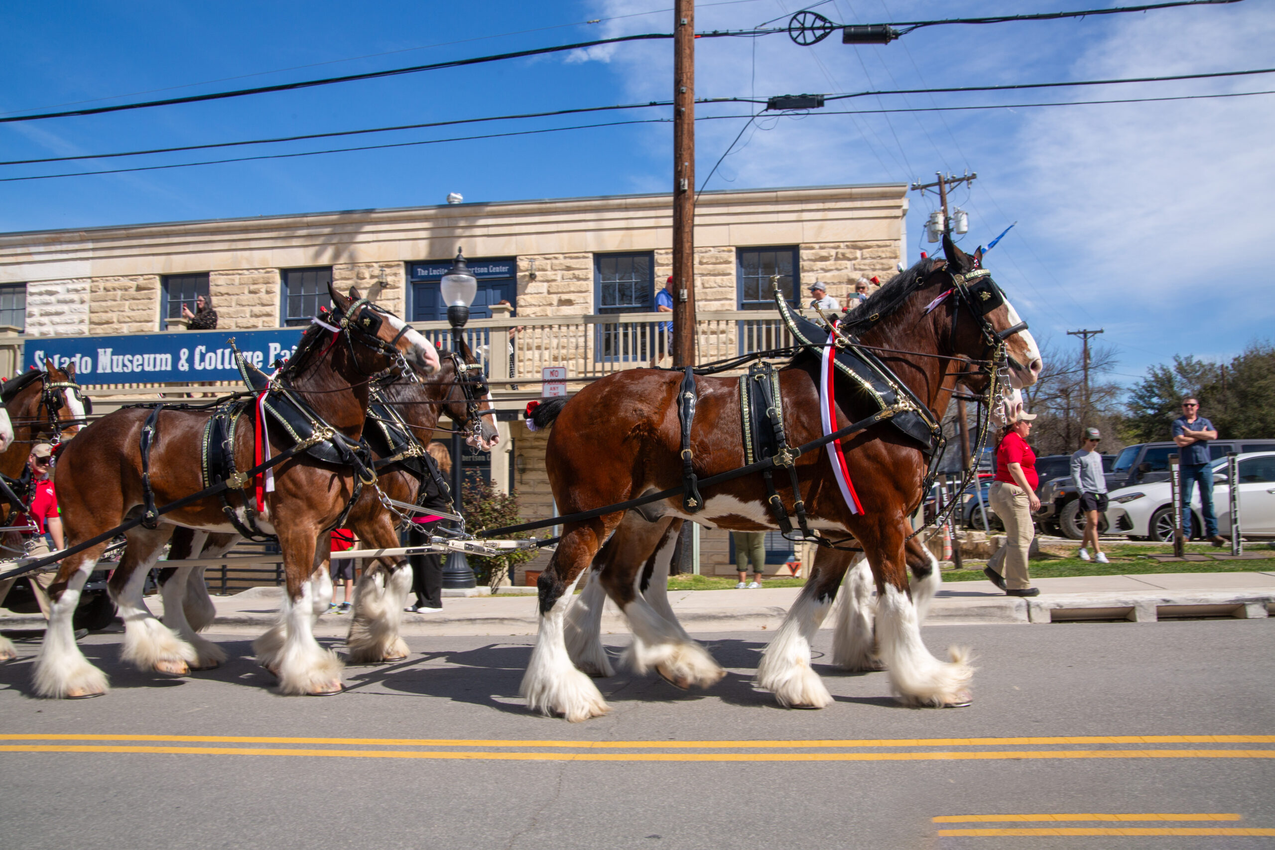 Scene Scene | Budweiser Clydesdales stop in Salado May 26, 2024May 21, 2024 Tex Appeal staff Budweiser Clydesdales, Salado Photos by BECKY STINEHOUR Clydesdale horses pull the Budweiser wagon up Main Street in Salado. Crowds line Main Street in Salado as they wait for the Clydedales to arrive. Festival-goers try their hands at homemade pizza in Salado. A team of Clydesdales horses pull a Budweiser wagon up Main Street in Salado. Clydesdales pull the Budweiser wagon up Main Street in Salado.