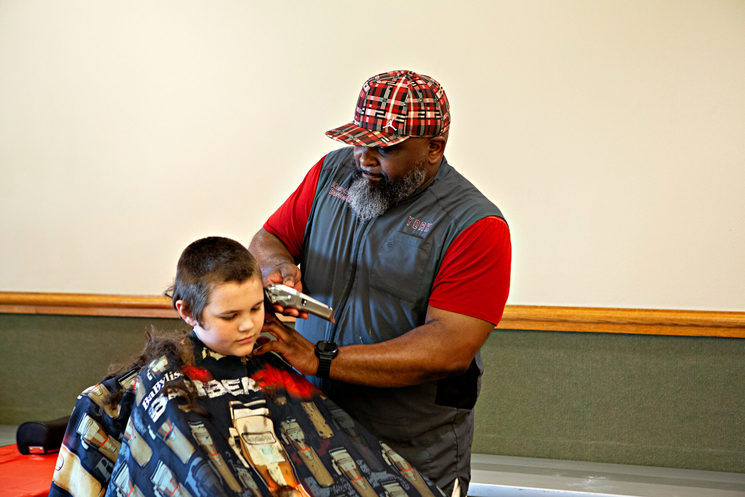 James Taylor gives Kurtis Glover a back to school haircut at the Cuts With Cops event in Harker Heights