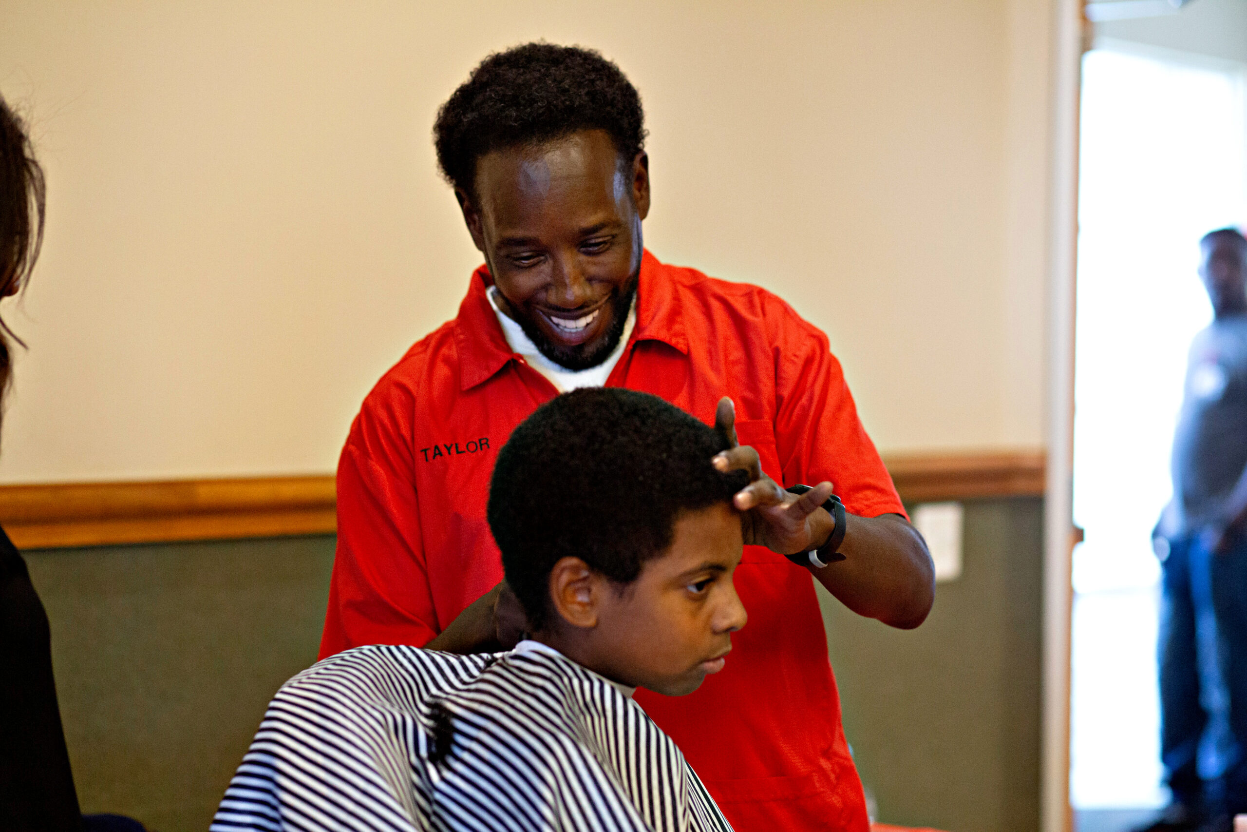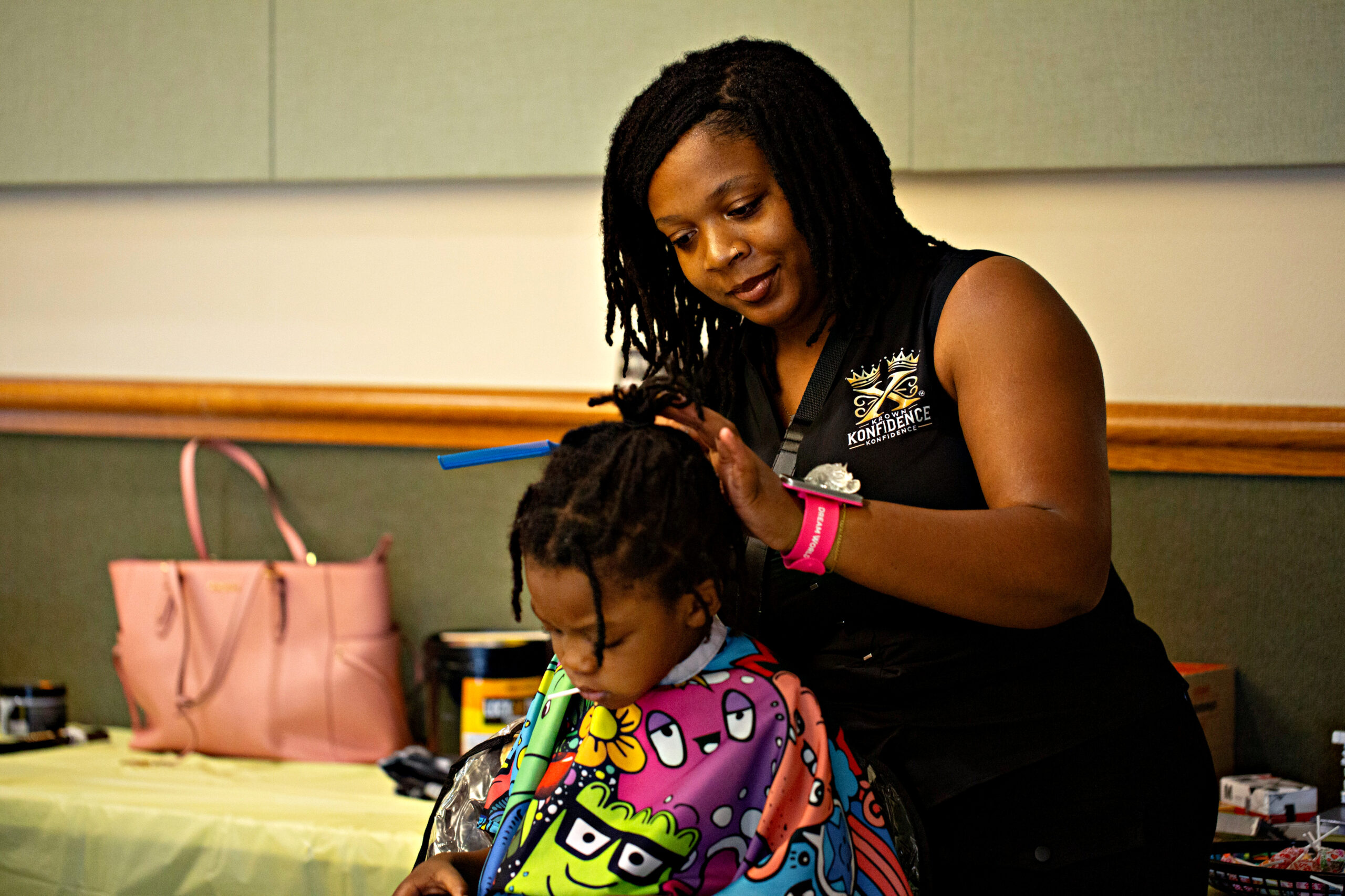 Erikka Jones styles Jaquan Dominique’s hair for back to school at Cuts With Cops in Harker Heights