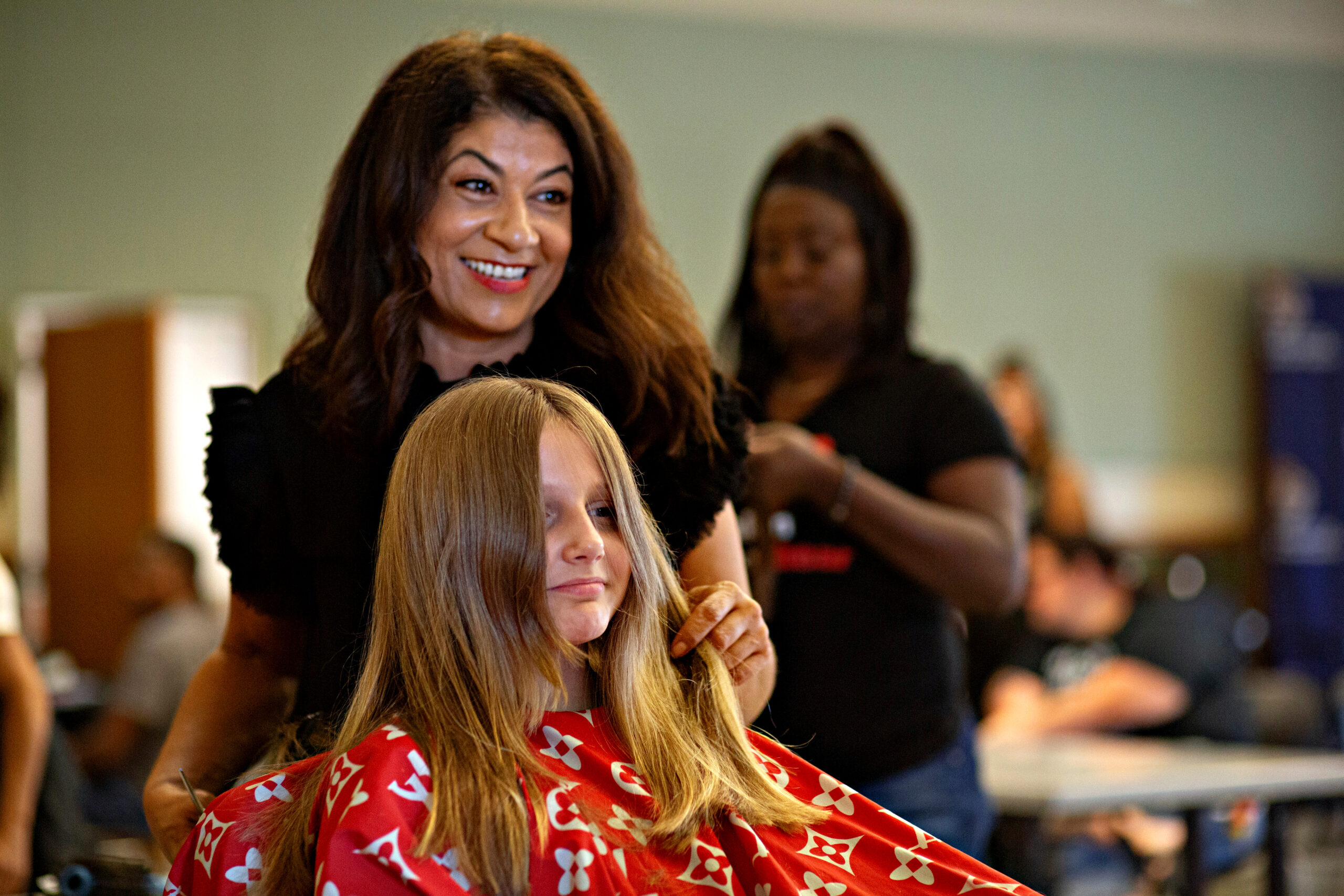 Monica Hall smiles as she styles Giada French’s hair at Cuts With Cops in Harker Heights