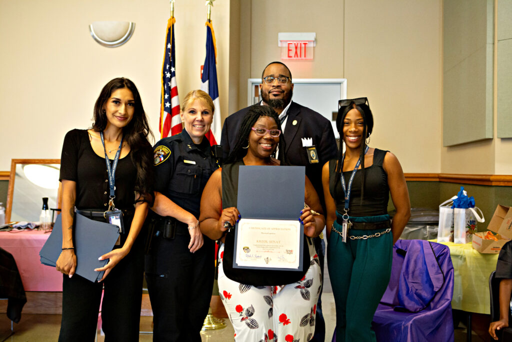 Back Row: Crime Victim Coordinator/ Healthy Homes Coordinator Erica Lozano, Deputy Chief Sonja Clay, Director of Public Safety/ Chief of Police Betiale Hawkins, Youth Specialist Jazmyne Lee
