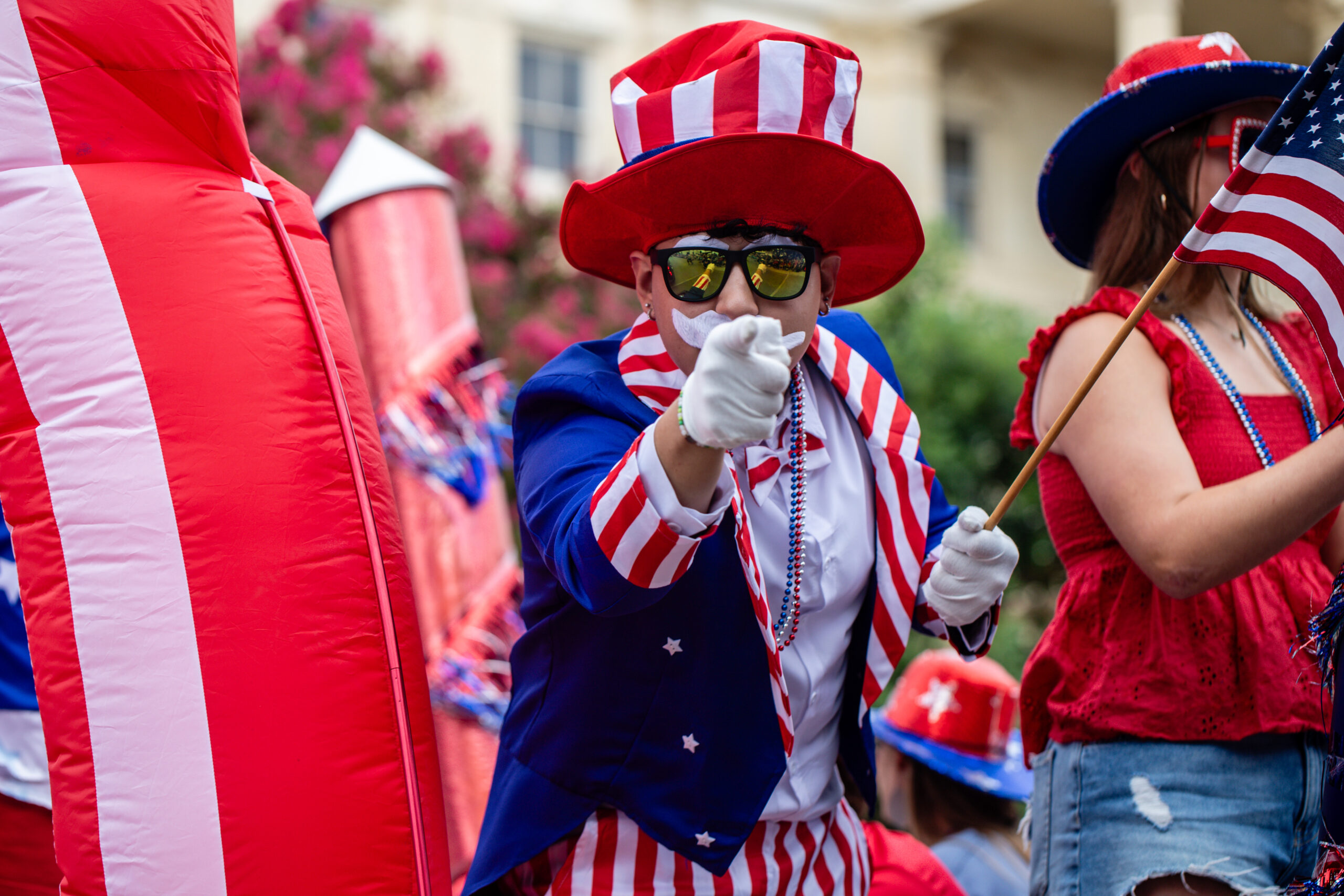 Uncle Sam points from his parade float.