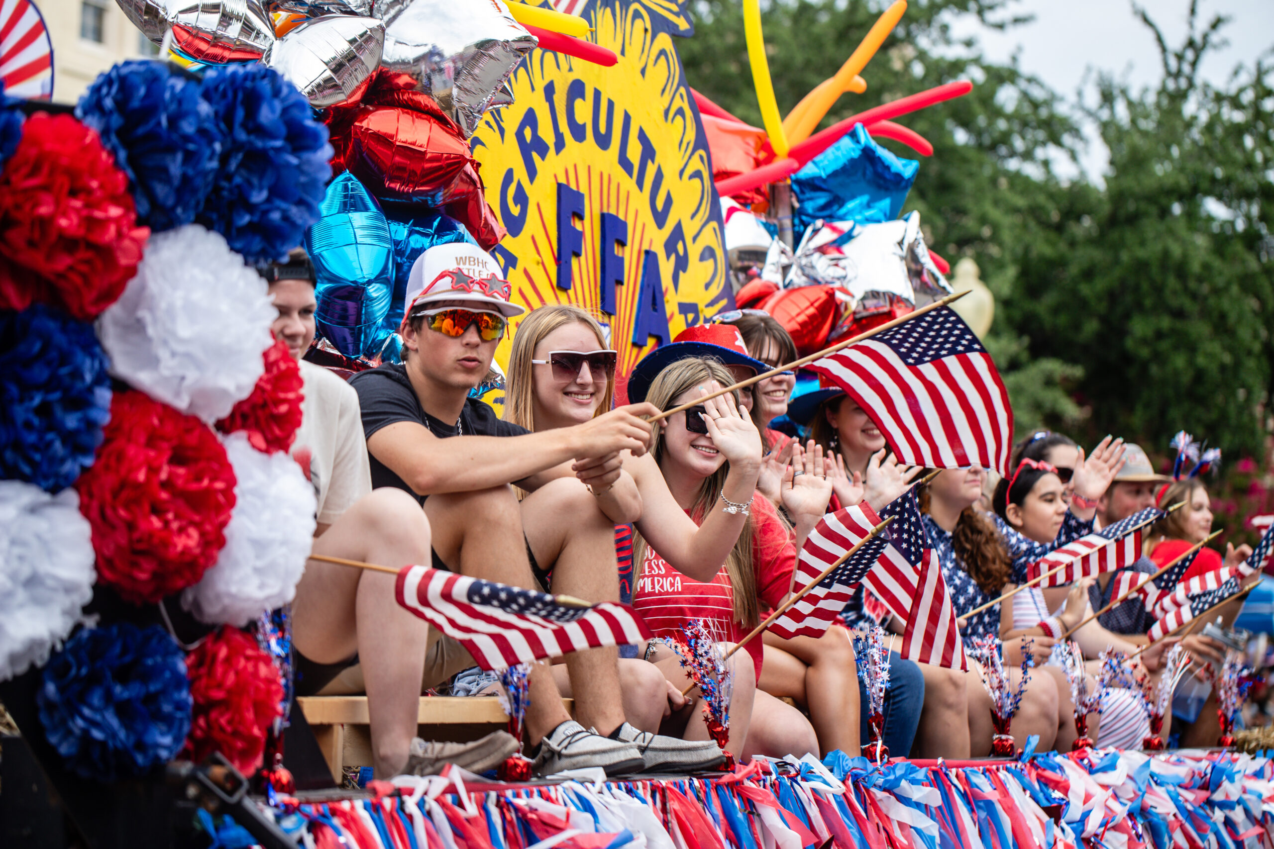 The Belton FFA smile and wave at the crowd as their float rolls by.