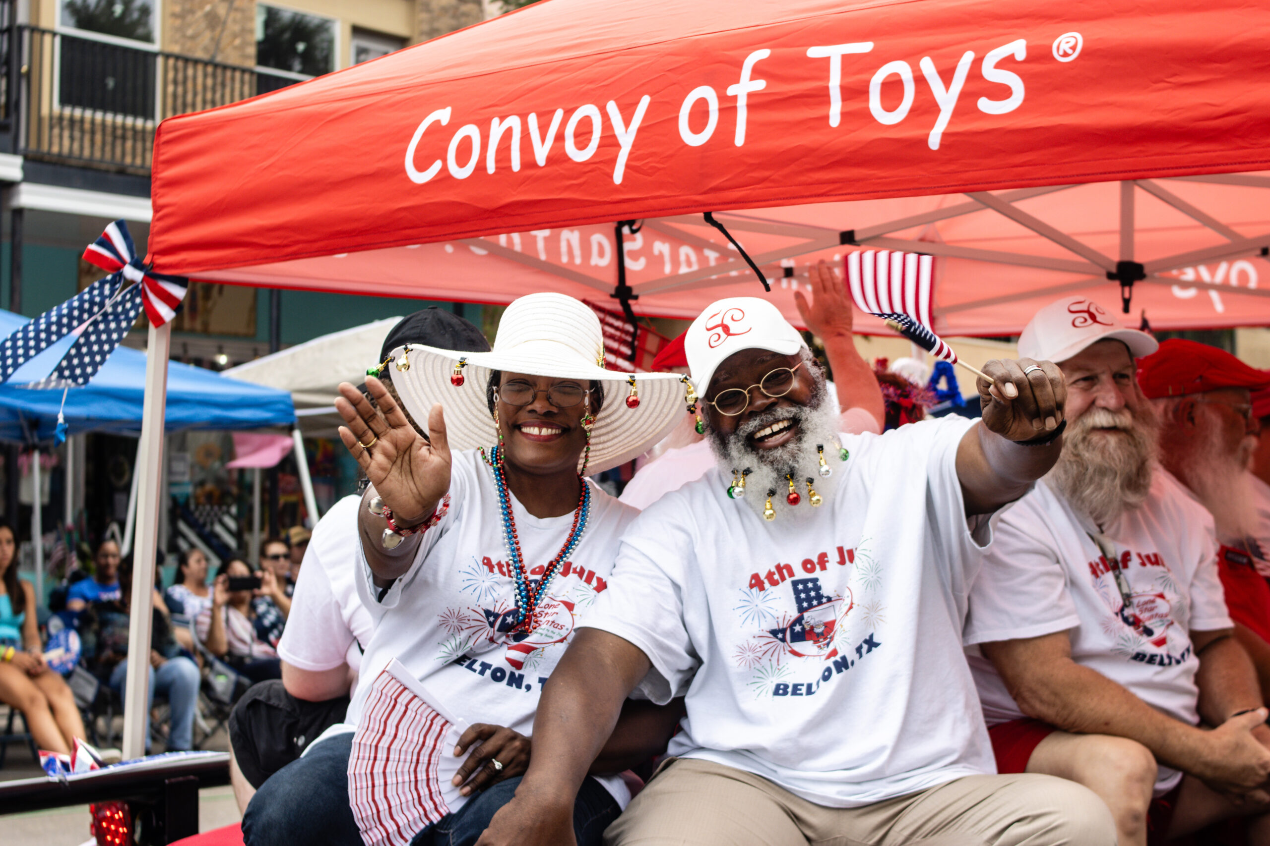 Moeisha and Erik Elliott, aka Mrs. Claus and Santa, wave from the Lone Star Santa float.